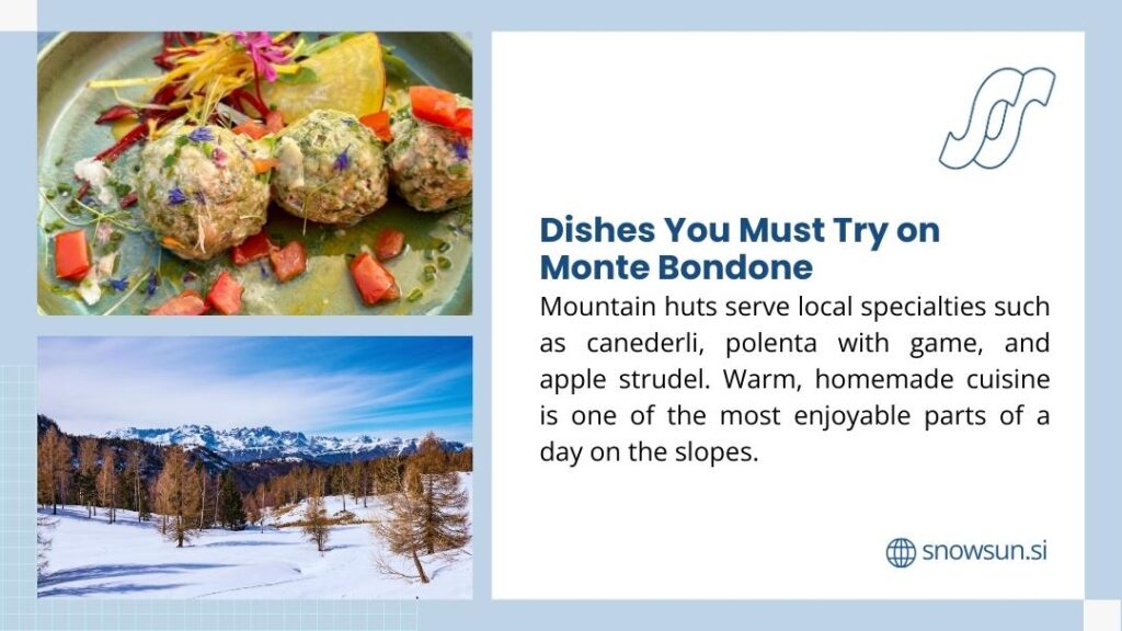 Monte Bondone smučanje ponuja 20 kilometrov urejenih prog. To ni veliko v primerjavi z večjimi kompleksi, a ravno ta manjša velikost ustvarja intimno, sproščeno atmosfero brez prevelikih gneč.